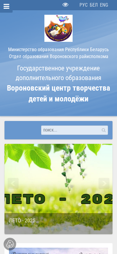 | AI-анализ | The portal Voroновский центр творчества детей и молодёжи (Voronovo Children and Youth Creative Centre) is a government educational institution located in the Sovietska Street, Voronovo, Grodnen Oblast, Belarus. The centre focuses on creative development of children and youth. It is hosting several events in November 2025, including the "Pojezd pamyati" project commemorating the 80th anniversary of the Victory in the Great Patriotic War, and the regional competition for children's scientific projects on ecological and biological themes named "Transparent Waves of Narochi". The centre also provides information on the latest news in the district, region and industry, as well as various educational opportunities, such as a visit to the exhibition "Creative Magic: New Year and Christmas Works" and a presentation by the Grodno State |