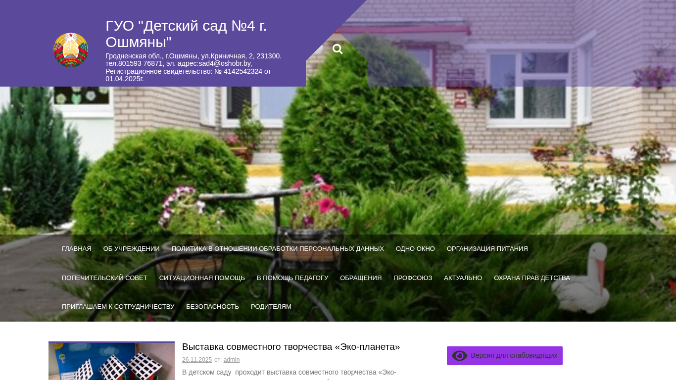 | AI-анализ | The web project "ГУО "Детский сад №4 г. Ошмяны" (Child Care Center No. 4 in the city of Oshmyany, Grodno Region) provides information about the kindergarten's location, contact details, and registration information. The kindergarten is situated in the city of Oshmyany, ul. Krynichenka 2, 231300. The contact numbers are 801593 76871, and the email address is sad4@oshobr.by. The registration certificate number is 4142542324, issued on April 1, 2025. The website includes sections on the kindergarten's management, tasks and functions, pedagogical staff, group composition for the upcoming school year, conditions for admitting children |