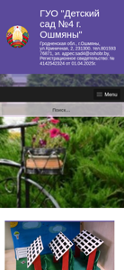 | Название / Заголовок | ГУО "Детский сад №4 г. Ошмяны" — Гродненская обл., г.Ошмяны, ул.Криничная, 2, 231300. тел.801593 76871, эл. адрес:sad4@oshobr.by, Регистрационное свидетельство: № 4142542324 от 01.04.2025г. |