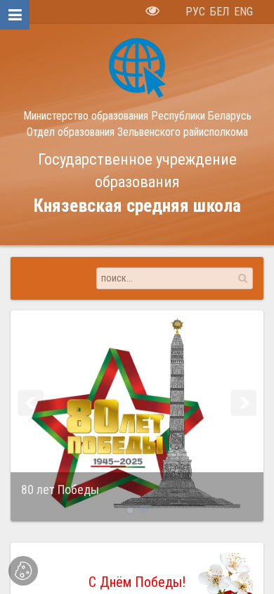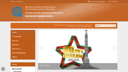 | AI-анализ | The website is for Kniazevskaya Srednya Shkola (Kniazevo Middle School) located in the village of Kniazevo, Zhelvan District, Grodno Region, Belarus. The title and description indicate that the website is dedicated to the 80th anniversary of Victory Day in the Great Patriotic War. The school is a state educational institution and is under the jurisdiction of the Ministry of Education in the Republic of Belarus. The website contains news and event information, including educational programs, school activities, and community initiatives. Key topics include the "Project 'Fate of the Country in the Hands of Teachers'", the 'Day of Defense of Belarus' and various thematic weeks, decadies, and actions. The website also features a news archive and information on upcoming events, such as a Proactive Talk with a Traffic Inspector |