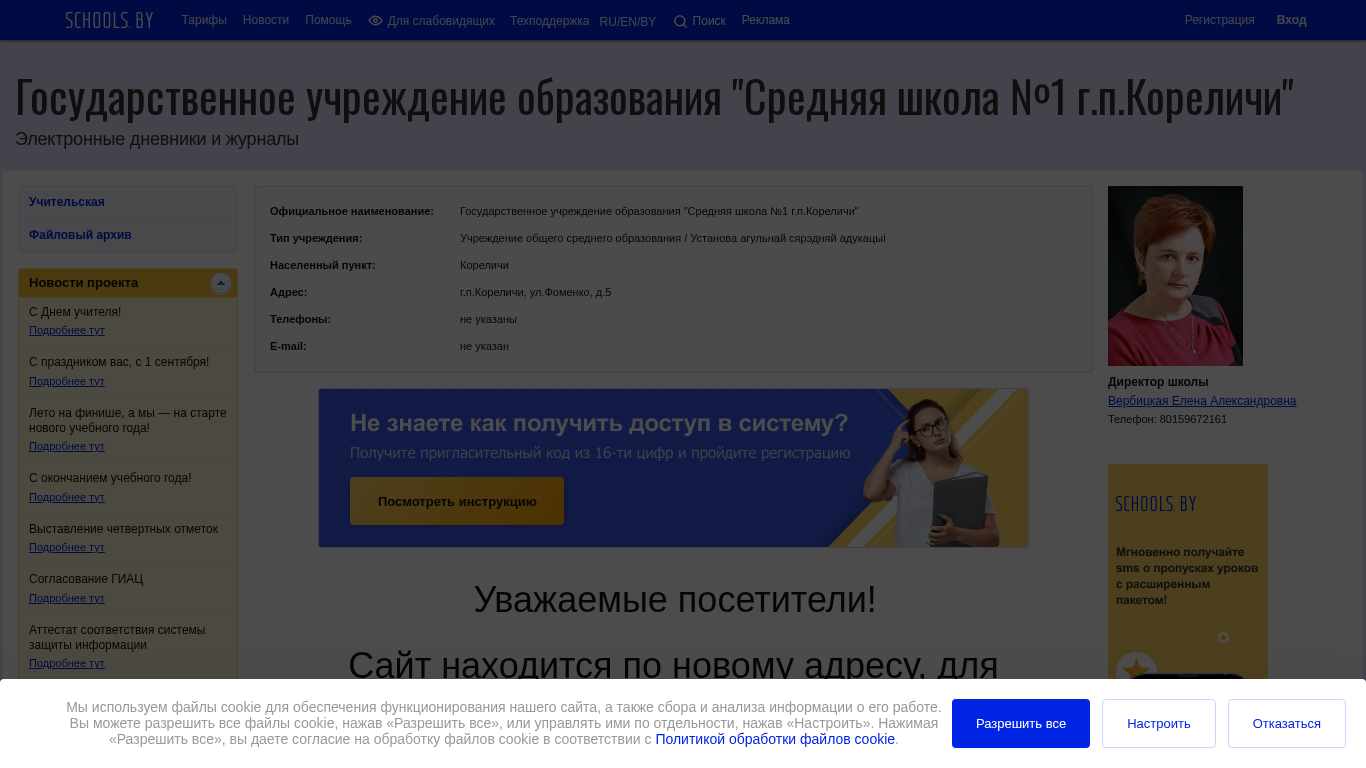 | AI-анализ | The portal gimnkor1.schools.by is a Belarusian state educational institution website named "Средняя школа №1 г.п.Кореличи" (Middle School №1 in Korenichi). The website uses cookies for site functionality and data collection and analysis. Visitors can allow or manage cookies through the site's cookie policy. The color scheme of the site is gray with text in black. Images are turned off in black and white. The site provides a link to the cookie policy and an option to accept or manage cookies. The domain is gimnkor1.schools.by. |