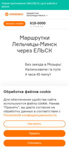 | AI-анализ | This website is for booking route taxis from Minsk to Leльчицы via Ельск and back on the M5 highway. An offer includes a fare of 38 BYN and additional services such as free Wi-Fi, films during the ride, and online seat reservation. Users can contact the company using numbers for MTS, Velcom, and Life mobile networks. The site also mentions a new SMILEBUS application for Android and iPhone. The route covers various destinations including Leльчицы-Minsk, Жлобин-Minsk, Жлобин-Гomeль, Гомель-Minsk, Речица-Светлогорск-Minsk, Мозырь-Калинковичи-Minsk, Рогачев-Minsk, Рогачев-Gomeль, and Кобрин-Mins |