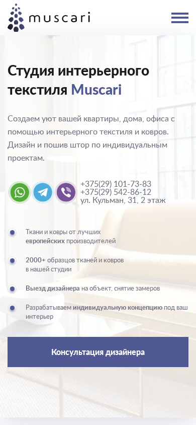 | Адрес | текстиля и ковров. Дизайн и пошив штор по индивидуальным проектам., +375(29) 101-73-83, +375(29) 542-86-12, ул. Кульман, 31 |