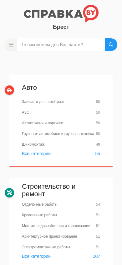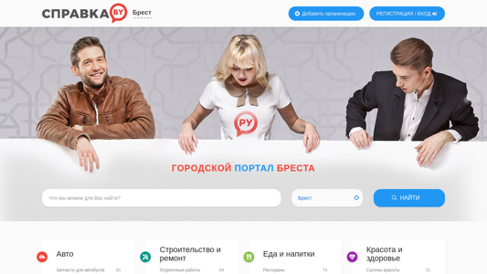 | AI-анализ | The web project 'Городской портал Бреста, справочник организаций' (Brest City Portal, Business Directory) is a website for the city of Brest that functions as a business directory and catalog of organizations. All useful information can be found on Spravka.BY. The site offers various categories including 'Авто' (Autos), 'Строительство и ремонт' (Construction and Repair), 'Еда и напитки' (Food and Beverages), 'Красота и здоровье' (Beauty and Health), 'Спорт и фитнес' (Sports and Fitness), and 'Услуги' (Services). Under each category, there are subcategories such as 'Автостоянки и паркинги' (Auto Parking and Car Parks), |