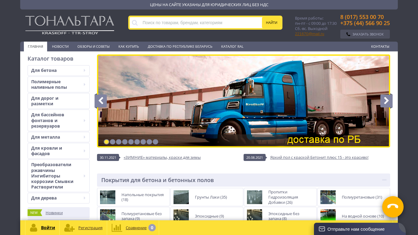 | SEO-описание | Компания Тональтара - надежный поставщик лакокрасочных материалов в Республике Беларусь. Оптовая и розничная продажа красок, лаков для металла, бетона, дерева и промышленных наливных полов. |