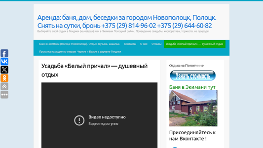 | AI-анализ | The website is for a rental service of a cabin, sauna, and gazebos located in the areas of Gendiki and Ekimani near the cities of Novopolotsk and Polotsk in Belarus. Visitors can rent these facilities for a day and contact the service at the provided phone numbers for bookings. The website mentions the availability of organizing weddings, corporate events, and celebrations in nature. The rental service includes a spacious heated house with a fireplace, a sauna, and two gazebos, as well as mangals for preparing shashlyk on coals. The usadba 'White Pier' is also mentioned as a place for a relaxing retreat. The website is located at 2ozera.by. |