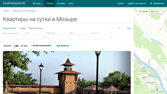 | AI-анализ | The web project Mozyr.kvartiranasutki.by is a real estate listing platform for renting apartments in the city of Мозыре, Belarus, on a daily basis. The website offers direct contact with property owners, eliminating the need for intermediaries. It provides prices starting from $19, search options on a map, and authentic photos. The site's main sections include 'Kvartiry na suтки v Mozyre' (Quarters for a day in Mozyre), 'Format list bulleted' (List format), 'Map' (Location), and 'Blog'. The domain name includes 'mozyr' and '.by', representing the city and country, respectively. The site offers various apartment sizes, from studios to four-bedroom apartments, as well as houses and cottages. Users can filter their search by the number of guests, micro- |