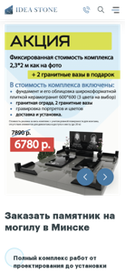 | AI-анализ | --- The web project "Idea Stone" offers memorial services in Minsk, Belarus. Customers can order and purchase memorial monuments with delivery throughout the country. The company provides 0% financing, a 15-year guarantee, and free storage. Services include monument installation, graveyard decorations, and restoration. The website also features a blog, FAQs, and contact information. Products include various memorials made of granite, glass, bronze, and metal. Customers can choose from vertical or horizontal designs, and various forms such as single or double, European, heart-shaped, or cross-shaped. Additionally, the site offers various decorative elements and artistic designs. |