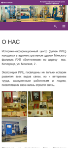 --- The portal minsk-historycenter.beltelecom.by is the website of the Historical-Information Center, a department of the Minsk branch of RUP "Beltelecom." The site provides information about the center, its history, and its exhibits. The center is located in the administrative building of the Minsk branch of Beltelecom, at the address Pos. Kolodishchi, ul. Minskaya, 2. The exhibits of the center are dedicated to the history of various types of communication, as well as to veterans of labor, distinguished workers, and people who have devoted their lives to the telecommunications industry. The site includes photographs and videos of veterans, as well as information about union events, the 70th anniversary of victory, and meetings with veterans and young specialists. There is also a unique exhibit of samples of cable network elements on the territory of the base at Kol