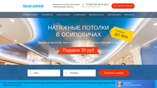 | AI-анализ | The web project "Natyazhnye Potolki in Osipovich" is a website that offers various types of suspended ceilings in Osipovich and the surrounding area. The company provides a wide range of options, including two-level, glossy, satin, matte, and photo-printed ceilings. Prices mentioned on the site are approximate and subject to change upon contract signing, as the ceiling tiles are custom-made to order. The company offers a free measurement service and delivery within the specified area. The production is sourced from China, France, and Germany, ensuring high quality and no odor. The website also features customer reviews and a contact phone number for inquiries and orders. The company guarantees a 10-year warranty on all products and offers discounts up to 38%. The website provides examples of completed projects and their costs, as well |