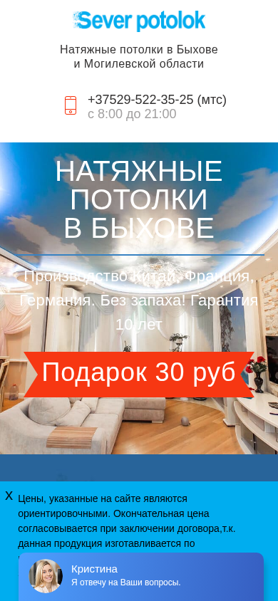 | AI-анализ | --- This online resource is dedicated to selling and installing various types of stretch ceilings in Býhov, Belarus. The website offers a wide range of stretch ceilings including two-level, glossy, satin, matte, and those with photo printing. Prices mentioned on the site are approximate and subject to change upon contract agreement, as the product is custom-made according to individual specifications. The company provides installation services in Býhov and the Moгилевskaya oblast, and customers can contact them by phone for inquiries and orders. The company guarantees its products for ten years and offers a discount of up to 38%. Production sources include China, France, and Germany, and all products are odorless. The website features a photo gallery of completed projects and customer testimonials. The contact information, including a phone number and a form for customers to request |