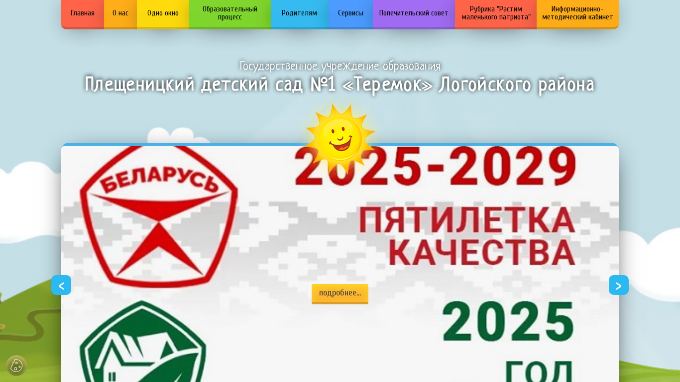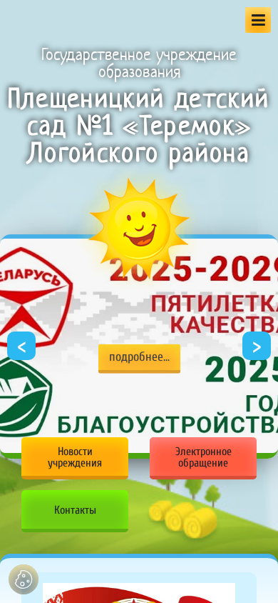 | AI-анализ | The website is for Pleschenitsky Detsky Sad No1 'Tereмок' in Lогойский Region, Belarus. It provides information about the kindergarten, its management, staff, educational programs, and activities. The site includes sections on admission procedures, administrative processes, contact information, and a photo gallery. The kindergarten's history, traditions, and achievements in education are highlighted. Interactive features such as an electronic application portal, a rating evaluation portal, and a situational assistance program for disabled individuals are also available. The website outlines the educational process, including informational technology and special educational programs. Various social-pedagogical projects and initiatives are presented, such as a letter-writing project, a social-pedagogical project for preschoolers, and a project for promoting patriotism. The site also includes information on the school's partnerships, committees |