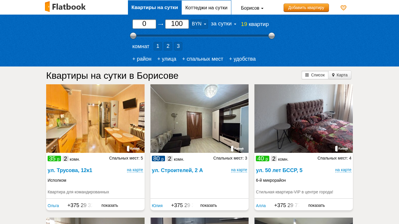 | SEO-описание | Квартиры на сутки в Борисове: 19 квартир 30-90 р. 1,2,3,4-х комнатные. Сутки/ночь/часы. Любой район. Цены от Хозяев. Выбирайте! |
