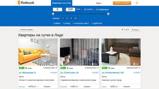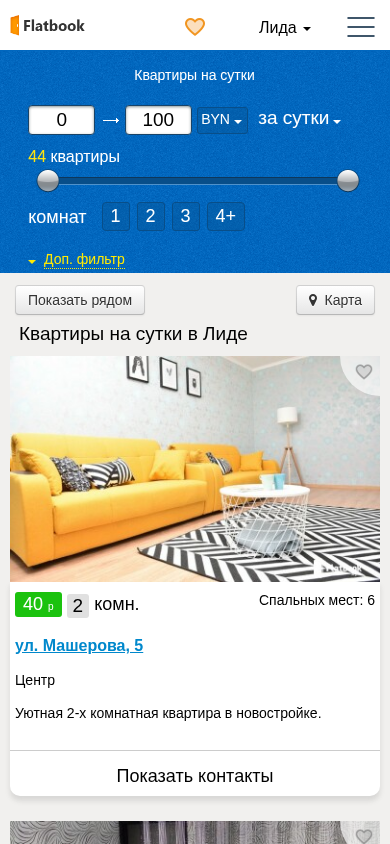 | AI-анализ | The portal offers apartments for rent by the day in Lida, with no intermediaries. Users can choose from 44 apartments, ranging from one- to four-room units, with prices from 30 to 100 Belarusian rubles per day, night, hour, week, or month. Apartments are located in various districts and can be filtered by room count, district, and utilities. Listings include apartment addresses, prices, and contact information for direct communication with the apartment owners. Examples of available apartments include a 2-room unit on ul. Masherova, 5 in the city center for 40 Belarusian rubles per day, and a 4-room unit on ul. Sovietskaya, 15 in the city center for 80 Belarusian rubles per day. The portal also includes a map view and a list view for brows |