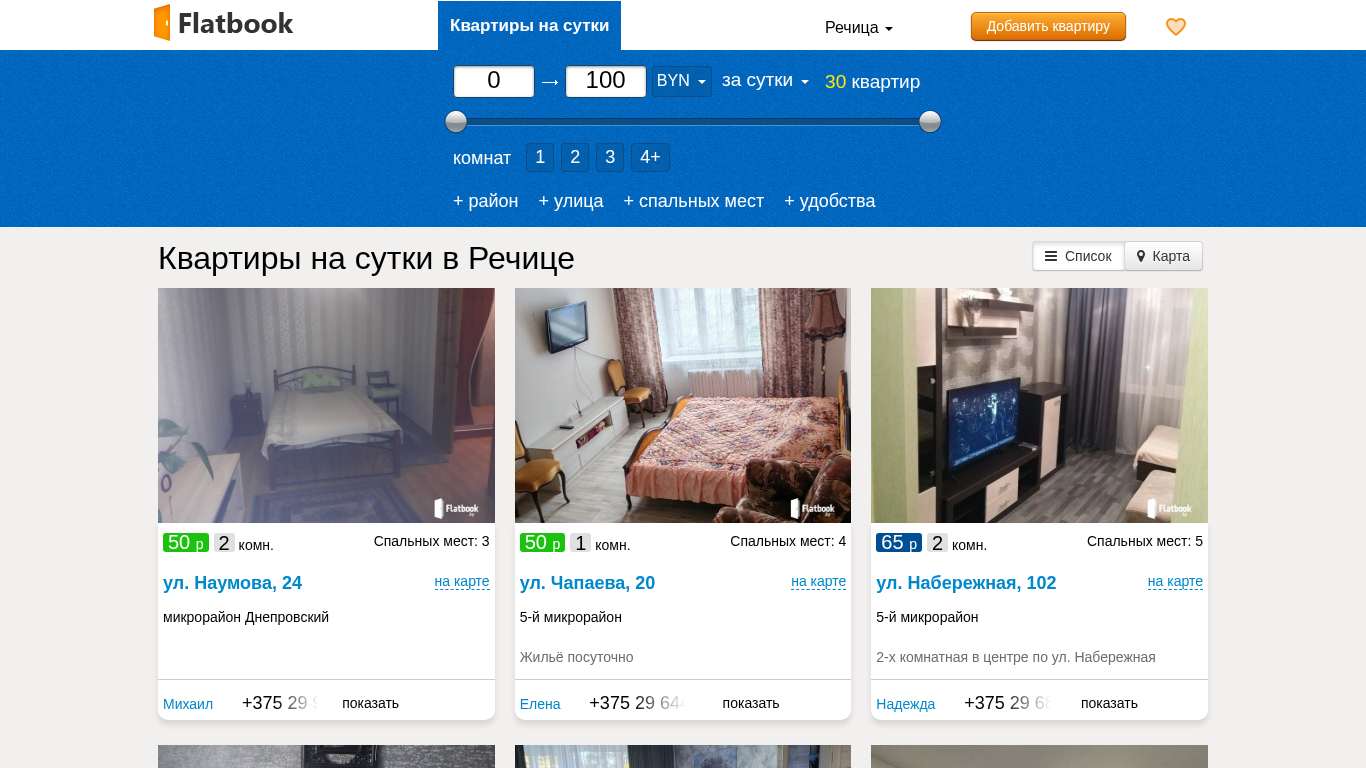 | SEO-описание | Квартиры на сутки в Речице: 30 квартир 45-100 р. 1,2,3,4-х комнатные. Сутки/ночь/часы. Любой район. Цены от Хозяев. Выбирайте! |
