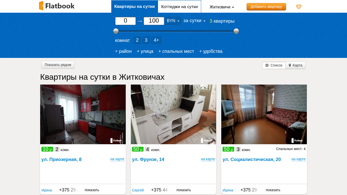 | SEO-описание | Квартиры на сутки в Житковичах: 3 квартир 10-50 р. 1,2,3,4-х комнатные. Сутки/ночь/часы. Любой район. Цены от Хозяев. Выбирайте! |