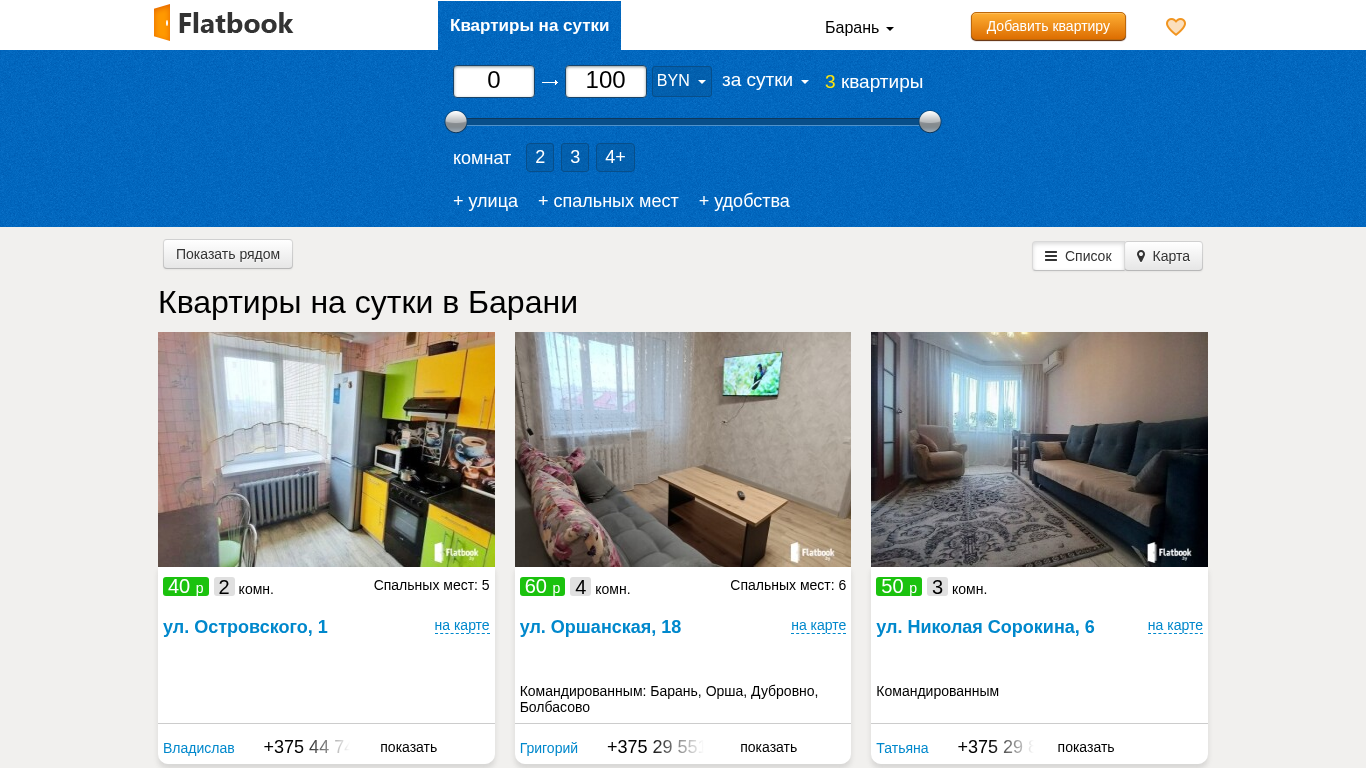 | SEO-описание | Квартиры на сутки в Барани: 3 квартир 40-60 р. 1,2,3,4-х комнатные. Сутки/ночь/часы. Любой район. Цены от Хозяев. Выбирайте! |