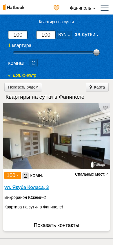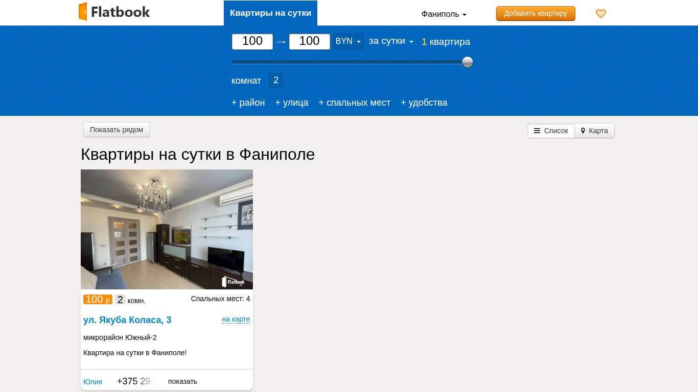 | SEO-описание | Квартиры на сутки в Фаниполе: 1 квартир 100-100 р. 1,2,3,4-х комнатные. Сутки/ночь/часы. Любой район. Цены от Хозяев. Выбирайте! |