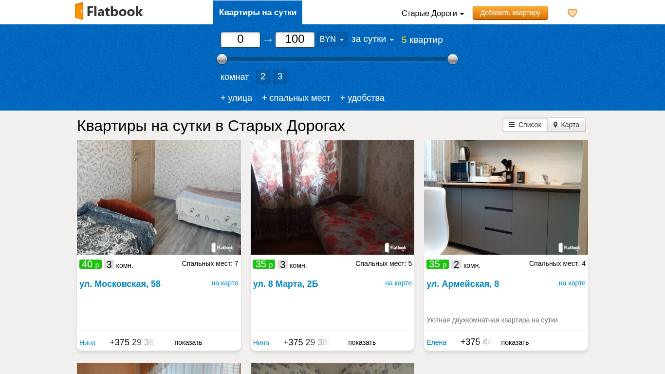 | SEO-описание | Квартиры на сутки в Старых Дорогах: 5 квартир 35-90 р. 1,2,3,4-х комнатные. Сутки/ночь/часы. Любой район. Цены от Хозяев. Выбирайте! |
