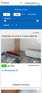 | AI-анализ | The website is a platform for renting apartments in the area of Old Towns (Старые Дорогахи) in Belarus, allowing users to find and contact the owners directly. It offers 5 apartments for rent, with 1, 2, 3, and 4-bedroom options, available for hours, days, or nights. The website lists the prices set by the owners and allows users to choose and contact them. Areas covered include Minsk, Brest, Vitsebsk, Mogilev, Gomel, Bobruisk, Baranovichi, Polotsk, Novopolotsk, Soligorsk, Borisov, Lida, Pinsk, Orsha, Moyer, Svetlogorsk, Zhobin, Zhodino, Kobrin, Sloym, Volkovysk, Smarhong, |