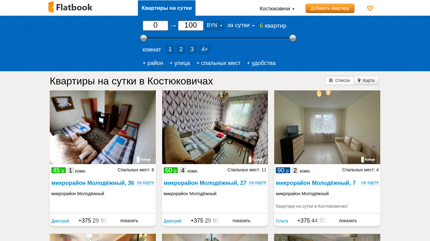 | SEO-описание | Квартиры на сутки в Костюковичах: 6 квартир 45-90 р. 1,2,3,4-х комнатные. Сутки/ночь/часы. Любой район. Цены от Хозяев. Выбирайте! |