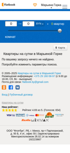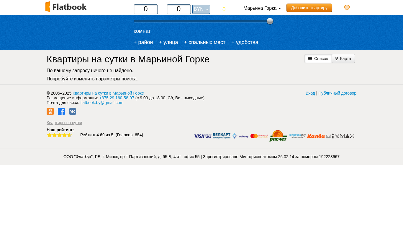 | AI-анализ | --- This online resource provides information on renting apartments for a day in Mariina Gorka, Belarus, without involving intermediaries. The website offers a selection of one-day rentals, including studio and multi-room apartments, with prices set by the property owners themselves. Users can browse listings by city, including major cities such as Minsk, Brest, and others, and filter their search by number of bedrooms and available amenities. The website also includes a public rental agreement and offers customer support through phone and email. The domain is managed by OOO "Flatbook" and was registered in 2014. The website has a rating of 4.69 out of 5, based on 654 user reviews. The domain is part of the flatbook.by network. |