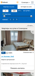 | AI-анализ | --- The web project "Soligorsk.flatbook.by" offers apartments for rent in Soligorsk on a daily, hourly, and monthly basis without the need for intermediaries. It lists 32 apartments, ranging from one-room to four-room units, in various districts and at various prices set by the property owners. Users can add new apartments, view them on a map, and contact the owners directly for booking information. The site includes apartments in various neighborhoods, prices, and amenities, and users can choose based on their preferences. |