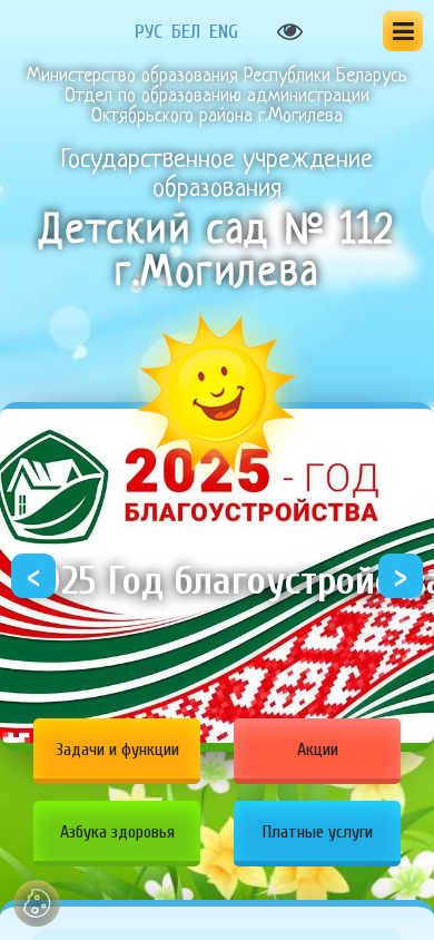 | AI-анализ | --- This website is for a kindergarten named "Детский сад № 112 г.Могилева" (Kindergarten No. 112 in Mogilev, Belarus). The title and the description of the website contain keywords related to the kindergarten, Mogilev, education, and contacts. The top words suggest that the website provides information about the kindergarten's structure, history, achievements, and news. The website also offers virtual classes, consultations, and links to legal documents. The kindergarten's administration's work hours and contact information are available, along with information about the kindergarten's leadership, teachers, and various educational programs. The website also features sections on health and safety, social-pedagogical support, and legal policies. The domain name is detsad112mogilev.by |