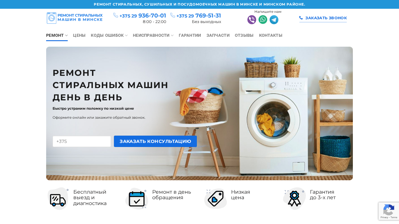 | SEO-описание | Ремонт стиральных машин в Минске недорого с выездом на дом. ⭐ Бесплатная диагностика. ⭐ Гарантия. ⭐ Без выходных. Звоните! ☎️ +375 (29) 769-51-31 |