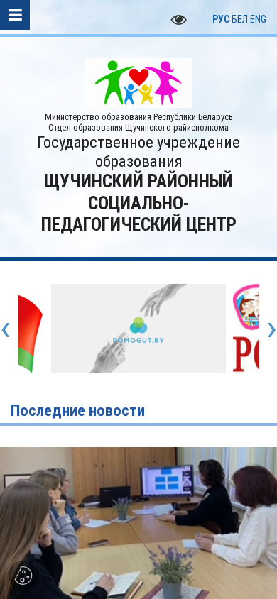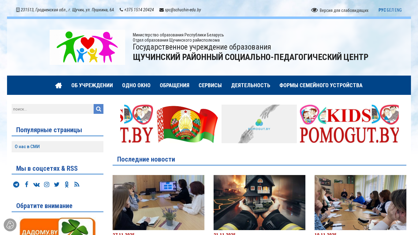 The web project "Щучинский районный социально-педагогический центр" (Schuchin District Social-Pedagogical Center) is a Belarusian educational institution located in the city of Schuchin, Grodno Oblast, with a mailing address at ul. Puškina, 6A and contact number +375 1514 20424. The website primarily targets users interested in the center's social and pedagogical services, as evidenced by the high occurrence of keywords related to education, prevention, and social services. The description mentions several regional and cultural references, such as the district name, the city name, and various ethnic groups, suggesting that the center serves a diverse population. The keywords also indicate that the website may contain news and results of surveys. The language options include Belarusian,