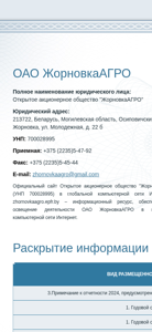 This online resource is the informational website of Open Joint Stock Company "ЖорновкаАГРО" (UNP 700028995). The website provides information about the company's activities in the global computer network Internet. There is no news section available on the website at present. The website contains various documents such as annual reports from 2012 to 2025, a report on dividend payments, and information from the company's development strategy. Users can access these documents by clicking on the links provided. The website also includes a login section for accessing a personal cabinet, and an option to register for a new account. The website uses Google Analytics for tracking user behavior and traffic.