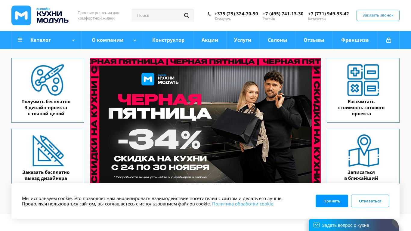 | SEO-описание | «Модуль Онлайн» - фабрика модульных кухонь из Беларуси. Сеть салонов в 4 странах. Стильные и недорогие модульные кухни и шкафы – до 40% дешевле, чем по индивидуальному заказу. Бесплатный 3D-проект от дизайнера. Каталог с фото и ценами. |