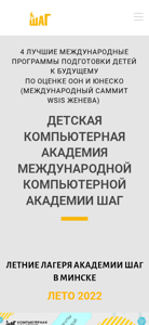 | AI-анализ | This website is an educational platform for children's programs offered by the International Academy Shag in Minsk, Belarus. It provides information on IT education for children aged 7 to 16, including details on various programs, their duration, and costs. The website mentions four international programs for children, including the Children's Computer Academy, Summer Camps, and an IT College for teenagers. The site also offers classes in various locations in Minsk and provides contact information for consultation and program selection assistance. The International Program is available in over 20 countries, including the United States and Switzerland. |