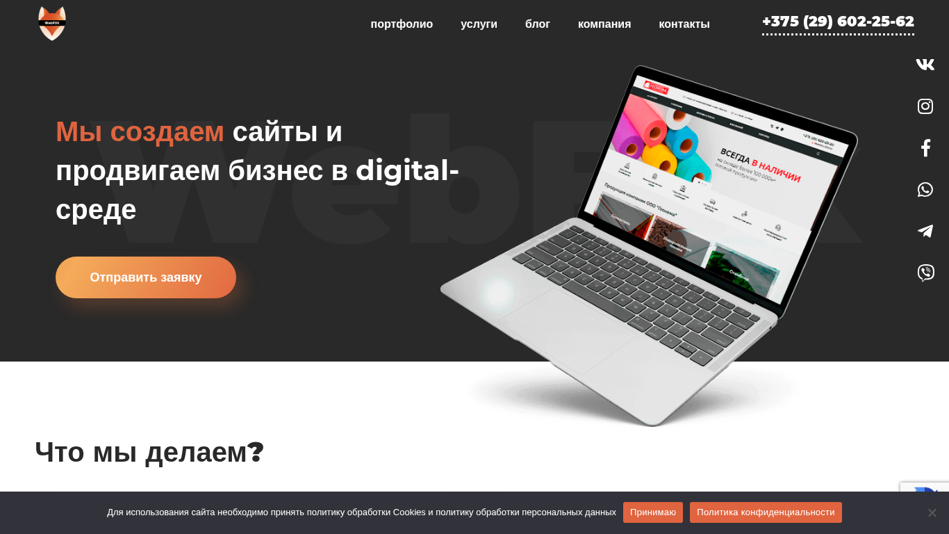 Адрессвязаться, Давайте обсудим Ваш проект, studio@webfox.by, +375 (29) 602-25-62, Пн-Пт с 9:00 до 18:00, ул. Всеволода Игнатовского, 4
