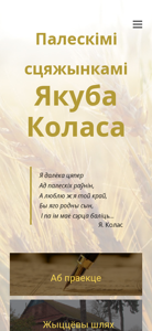 | AI-анализ | The portal "Paleskiimi scezhynkami Yakuba Kolaso" was created to commemorate the 140th anniversary of the birth of the classic Belarusian writer, poet, and public figure Yakub Kolas. The website is based on materials from the "Yakub Kolas in Pinsk" exhibit, which is located at the Pinsk City Children's Library named after Yakub Kolas. The website consists of five sections, each of which reveals the life and creative work of Yakub Kolas in Pinsk. Additionally, it contains literary-critical and archival materials, as well as information about places associated with the name of Yakub Kolas. The "Life Path" section covers the biographical periods of Yakub Kolas from 1902 to 1904, when he worked as a teacher in |