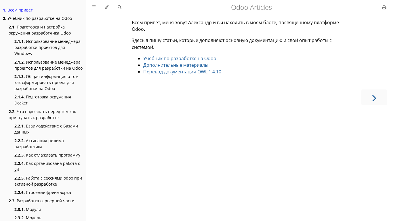 | SEO-лексика | odoo owl использование разработке разработки всем привет учебник работа перевод qweb объект articles подготовка окружения разработчика менеджера проектов windows проект |