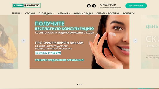 | AI-анализ | The website is an e-commerce platform offering professional cosmetics with delivery in Gomel and Belarus. It also provides consultation services from an experienced cosmetologist and offers various cosmetic procedures. The website includes sections for pricing, services, customer reviews, a shop catalog, and contact information. The top words include 'velinacosmetic', 'косметолога', 'оплата', 'доставка', 'консультация', 'процедуры', and 'отзывы'. The website has a section for discounts and promotions. The contact information includes a phone number and an email address. The website is in the .BY domain and is titled 'Профессиональная косметика с доставкой по Гомелю и РБ. Косметолог в Гомеле.' |