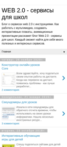 | AI-анализ | This online resource, titled "WEB 2.0 - сервисы для школ" (Web 2.0 - Services for Schools), is a blog about Web 2.0 services with instructions and examples. The blog covers topics such as multimedia work, creating interactive posters, and animated presentations for schools. Visitors can find a variety of useful and interesting services for different purposes. The blog includes sections for distance learning, teachers' resources, blogging, social networks, and more. The author shares personal experiences and discoveries related to using these services effectively. The blog was last updated on November 26, 2020. Some of the popular topics include online timer tools for lessons, interactive educational games for children, and online collage creators. Examples of mentioned services include Core, My TestXPro, and Slidely. The blog offers insights and guidance on using these services to enhance educational |