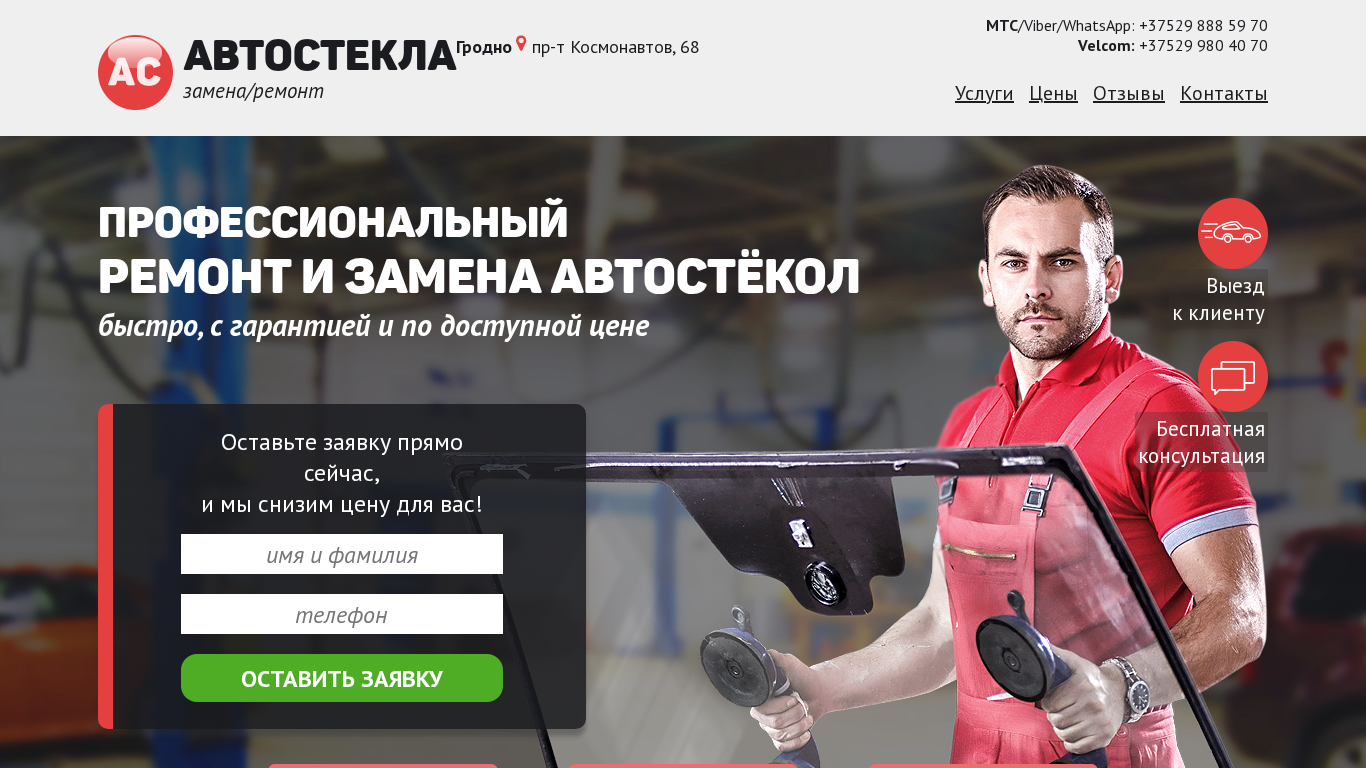 | SEO-описание | Профессиональный ремонт и замена автостекол в Гродно. ✅Быстро, с гарантией и по доступной цене. ✅Выезд к клиенту, бесплатная консультация. |