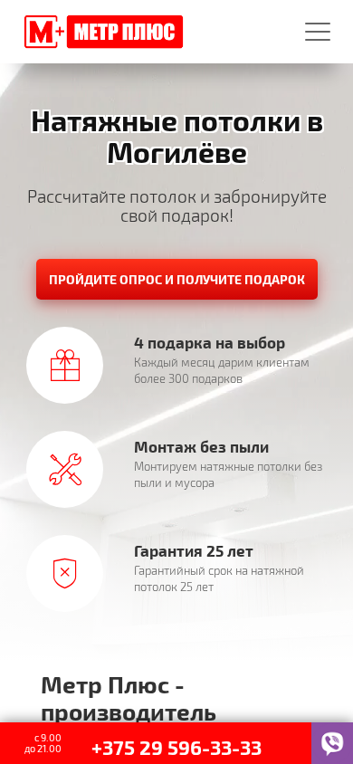 | SEO-описание | Приобритайте натяжные потолки в Могилеве по максимально выгодным ценам в РАССРОЧКУ до 12 месяцев. без участия банка и переплат. Натяжные потолки Метр плюс это всегда ВЫГОДНО. |