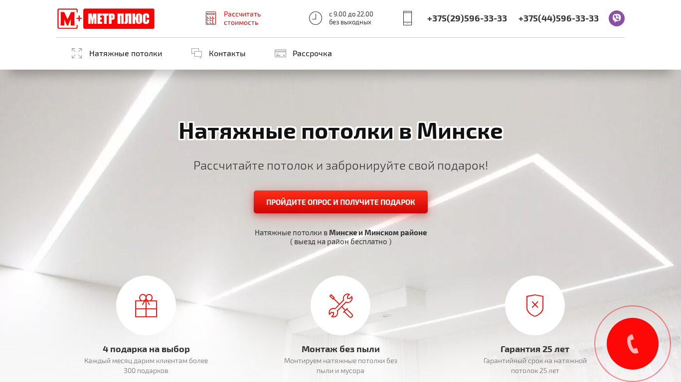 | SEO-описание | Приобритайте натяжные потолки в Минске по максимально выгодным ценам в РАССРОЧКУ до 12 месяцев. без участия банка и переплат. Натяжные потолки Метр плюс это всегда ВЫГОДНО. |