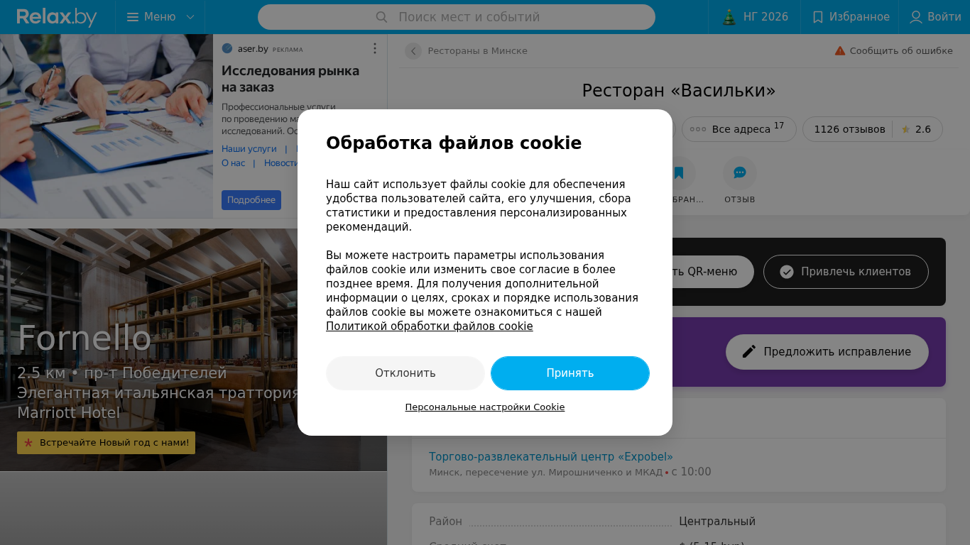 | AI-анализ | This online resource is a restaurant review website for "Васильки" in Minsk, Belarus. The title of the page includes the name of the restaurant, its location at the intersection of ul. Miroschnichenko and MKAD, and the keywords "отзывы, цены в меню, адреса и телефоны" (reviews, prices in menu, addresses and phone numbers). The description mentions that the website provides reviews, phone numbers, work hours, and a map for the restaurant "Васильки" located in Expobel shopping center. The top words indicate that the website is focused on restaurants in Minsk and includes functionality for saving favorite places and making reservations. The website also has 1126 reviews with an average rating of 2.6. The reviews praise the restaurant for its good food and excellent service, specifically mention |