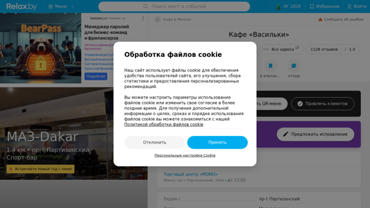 | AI-анализ | This website is an online platform for the "Васильки кафе" located at пр-т Партизанский 150а in Minsk, Belarus. The platform provides users with menu prices, customer reviews, the cafe's address on a map, and online table reservation through Relax.by. It also includes a search feature for places and events, a favorites list, and a login function. The website has 1126 customer reviews with an average rating of 1.0. Users can report errors, suggest corrections, and leave their own reviews. The cafe is located in the MOMO shopping center and is open until 23:00. It is near the Mogilevskaya Metro station and the Zavodskoy District. The website also displays information about nearby attractions, such as the MАЗ-Dakar sports |