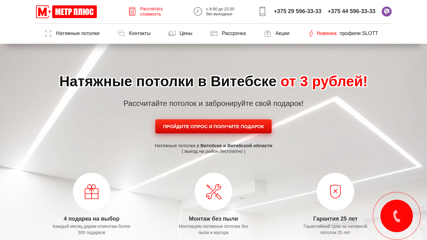 | SEO-описание | Лучшие ЦЕНЫ на Натяжные потолки в Витебске и области в Метр Плюс ⚡️ Стоимость от 3 руб ⭐ купить в Рассрочку 0% до 12 мес. ✅ Халва, ✅ Черепаха ⏩ Потолок в подарок! |