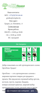 | AI-анализ | The website is an orthopedic salon called ОртоПлюс located in Grodno, Belarus. It provides a catalog of orthopedic products for children and adults from leading manufacturers. The contact information includes an address on ul. Popovich, 4, and a phone number +375(29)745-64-44. The store's hours of operation are Monday to Friday from 10:00 to 19:00 and Saturdays from 10:00 to 18:00, with Sundays being a day off. The website offers a variety of orthopedic items for sale and rent such as braces, orthoses, compression garments, shoe inserts, rehabilitation tools, and crutches. To rent an item, visitors can either come to the store or call the phone number provided. The |