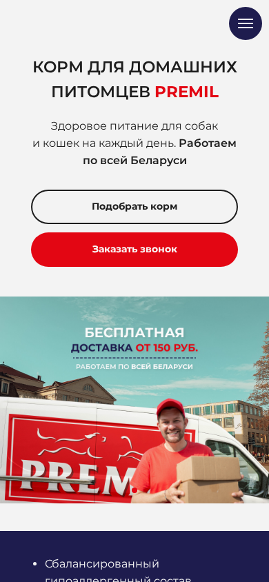 | AI-анализ | --- The portal Premil.by is an e-commerce website specializing in the sale of animal feed for dogs and cats. The company operates in Minsk and throughout Belarus. The website offers various Premil brands for both dogs and cats, providing detailed information about the ingredients and features of each product. Visitors can place orders for delivery or pick up in-person at selected locations in Minsk. The website also includes a phone number for customer inquiries and a section for ordering a callback. Minimum orders and prices are displayed, and the site offers various delivery options, including free delivery in Minsk with a discount on all Premil pet food. The website also includes a link to shop on Wildberries, another e-commerce platform, offering a wider selection and regular promotions. The Premil website aims to provide high-quality, balanced, and hypoallergenic pet food with a focus on natural |