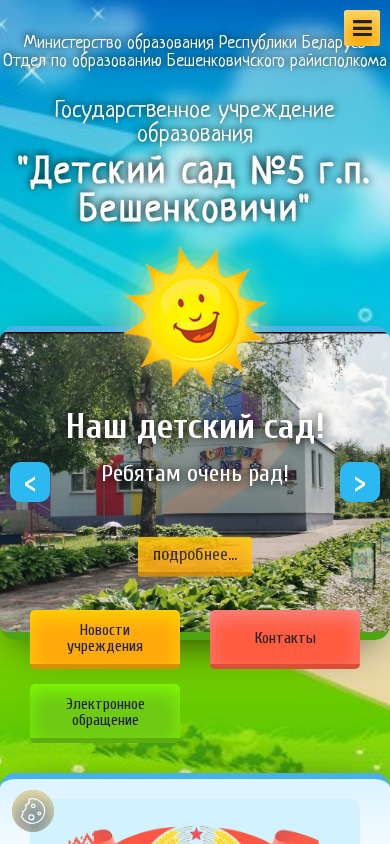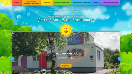 | AI-анализ | --- This website is for the "Детский сад №5 г.п.Бешенковичи" (Children's Kindergarten No.5 in the town of Beshenkovichi), providing information about the kindergarten's educational programs, structure, leadership, admission process, and various services. Key topics include kindergarten education, history, administration, work schedule, and contact information. The website also features sections on anti-corruption activities, labor safety, and a portal for evaluating the quality of services and administrative procedures of organizations in Belarus. The kindergarten's operational hours, admission process, and contact details are provided, along with information on educational programs, meals, and safety protocols. Additionally, there are sections on consulting services for the kindergarten's physical education, music, and special education instructors. The site also includes a section on the transition from kinderg |
