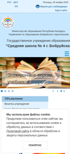 | AI-анализ | This website is for Middle School Number 4 in Bobruisk, Belarus. The title of the website is "Мiddle School Number 4 g. Бобруйска" (Middle School Number 4 in the city of Bobruisk). The description of the website is not provided, but based on the keywords and top words, it can be inferred that the website offers information about the school, its education, rules, and possibly provides forms and contacts for parents and students. The website uses the Ya.Metrika tracking system from Yandex. The language of the website is Belarusian. The keywords include words related to education, reading, further, advice, institutions, school, food, school-age children, and the number 2025. The top words include these keywords, as well as the words "rules", "help", and "psychologist". The website has tabs |