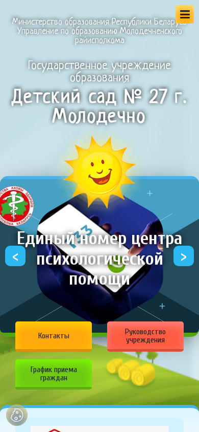 | AI-анализ | This online resource is a website for Kindergarten No. 27 in the city of Molodechno, Belarus. The title of the website is "Детский сад № 27 г. Молодечно" (Children's Kindergarten No. 27 in Molodechno). The description section includes keywords such as "учреждения" (establishments), "образования" (education), "безопасность" (safety), and "молодечно" (Molodechno). The top words on the website include "2025," "учреждения," "образования," "безопасность," "молодечно," "детский," "сад," "приема," "электронное," and "обращение." The website provides information |