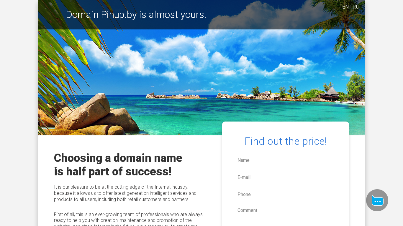 The portal pinup.by is currently parked and probably for sale. The domain name is managed by DomainParking.ru, a domain parking and monetization service. The description of the portal does not provide any information regarding its content or purpose. The keywords associated with the domain include words like 'domain', 'sale', 'future', and 'find out the price'. However, no price or contact information is provided.